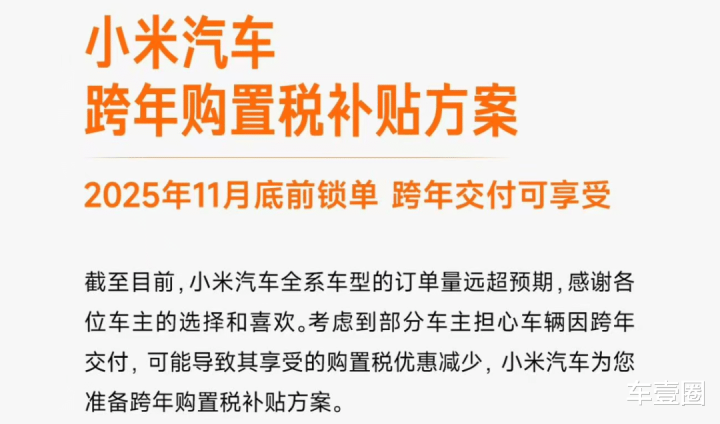 就在几天前,小米汽车率先发布跨年购置税补贴方案,即:凡在2025年11月30日24时前完成锁单,因小米汽车生产、运输等原因导致车辆需到2026年完成开票交付的用户,可享受“跨年购置税补贴”。为消除部分车主担忧车辆跨年交付后购置税优惠减少的顾虑,小米汽车将为符合条件的用户提供最高1.5万元的购置税补贴。